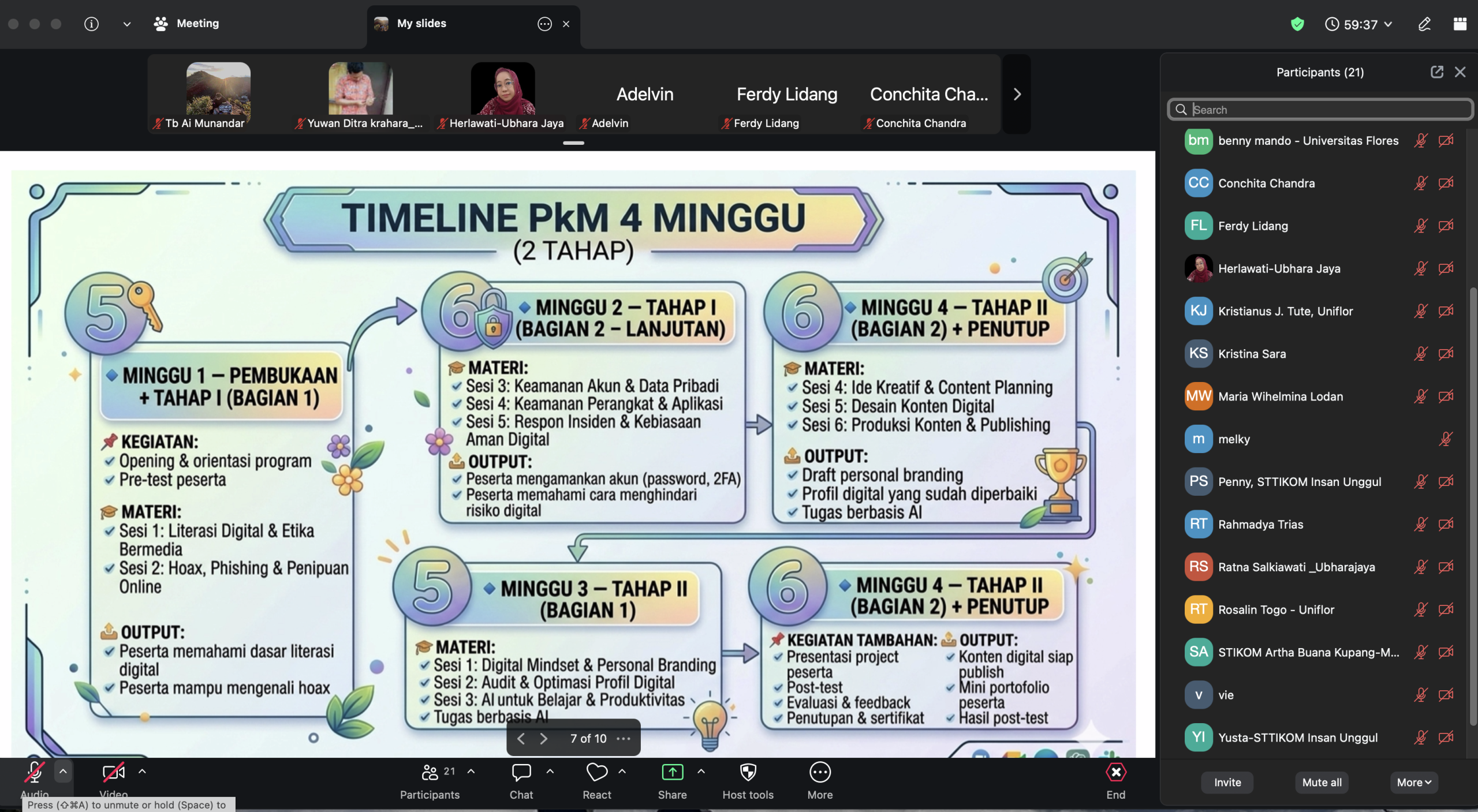 Melalui pemaparan timeline pelaksanaan, peserta rapat menyepakati skema implementasi PkM dalam dua tahapan utama selama empat minggu, dimulai dari pembukaan dan penguatan literasi digital, dilanjutkan dengan materi keamanan siber, kemudian masuk pada pengembangan kompetensi digital berbasis AI, kreativitas, desain konten, hingga produksi dan publikasi konten digital. Program ini juga dirancang menghasilkan luaran terukur, seperti peningkatan literasi digital peserta, draft personal branding, tugas berbasis AI, mini portofolio peserta, hingga publikasi hasil kegiatan.